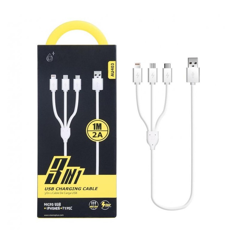 Cable 3 en 1 Micro USB 2.0 Smartphones y iPhone Blanco.