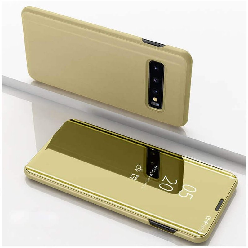 Funda Libro Smart Translucida Samsung Galaxy S10 Plus Dorada. Con acceso a cables, sistema para camara, sin necesidad de sacar el Smartphone de su funda para usarlo.