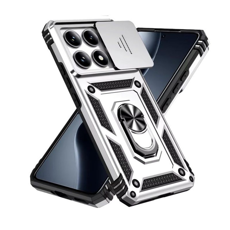 Funda Xiaomi 14T Tank antigolpes Imán. Carcasa Gris plata con anillo para dedo. Funda magnetica para poder usarse con con soporte auto aimantado.